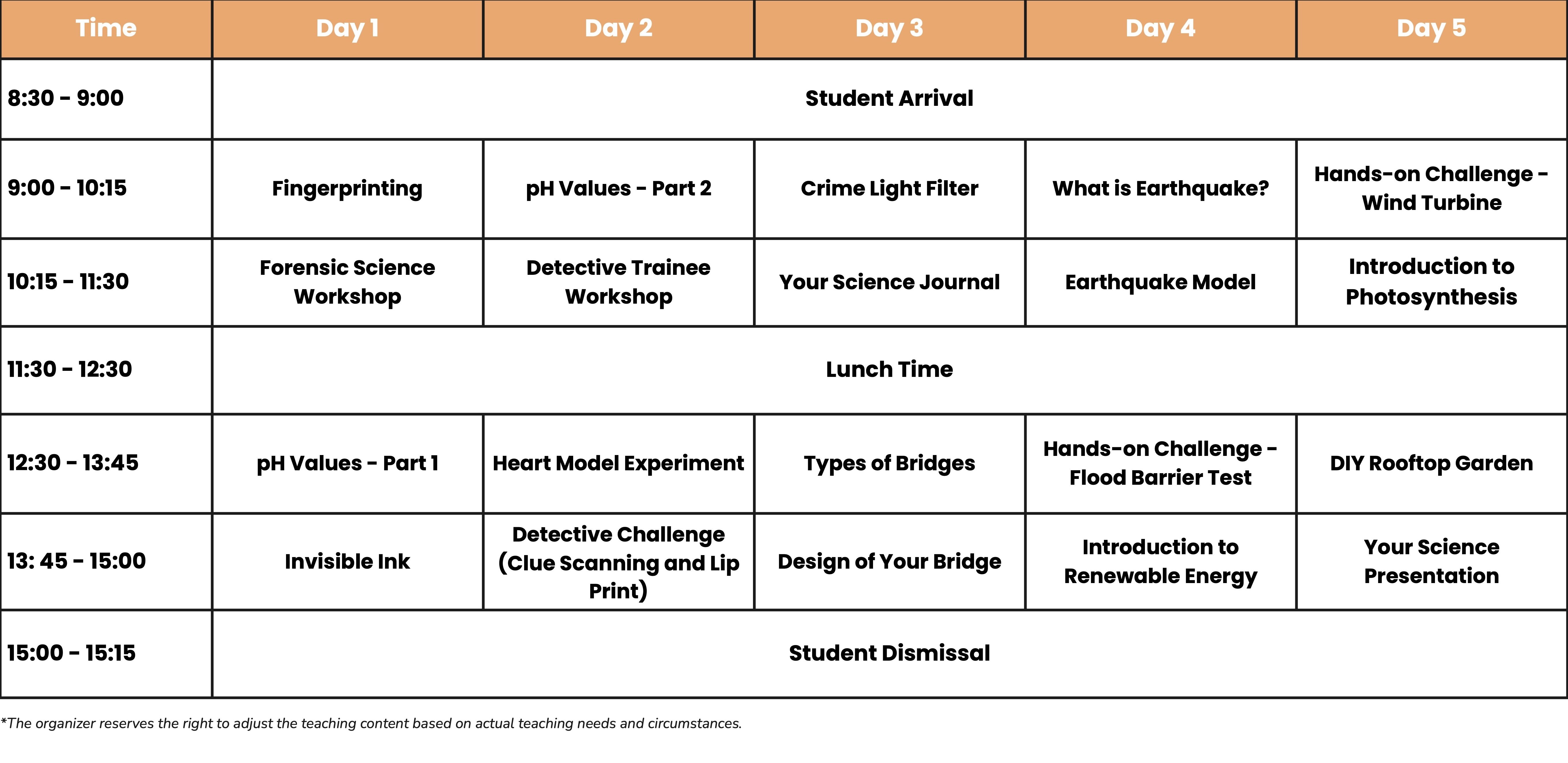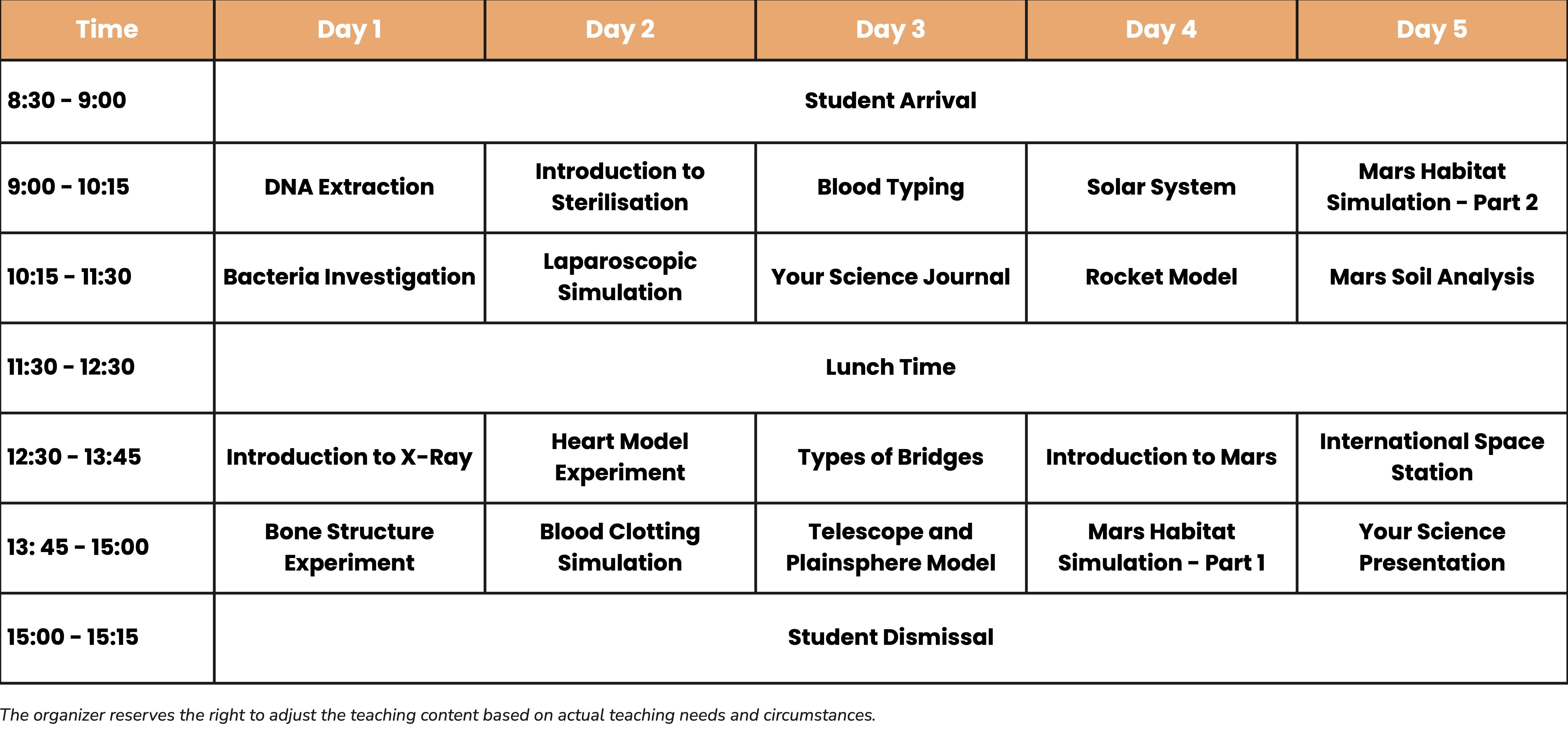 Two camps available for different ages, develop scientific thinking through hands-on experiments: Build earthquake-proof green cities in Sci-Venture Camp (age 6-8), or design rocket prototypes and Mars habitats in Inside-Out Mission (age 9-11).